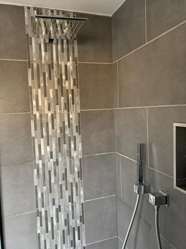 The tile is one of those stone type dark grey matt iykwim.